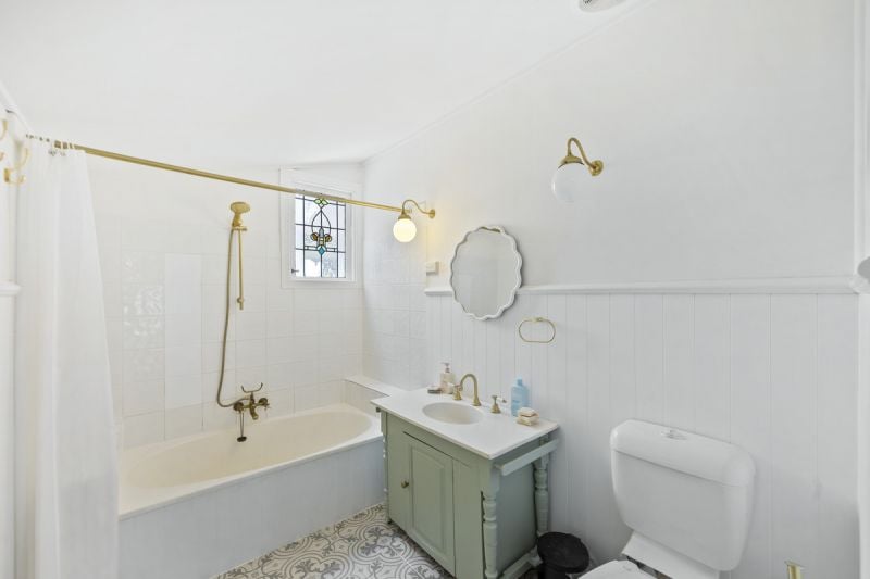 * Main bathroom includes a shower-over-bath and a charming vanity