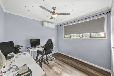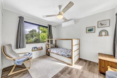 Upstairs, the enormous master retreat offers a peaceful sanctuary with its walk-in robe, air-conditioning, and private ensuite. Two additional bedrooms with built-ins, fans, and air-conditioning are serviced by a well-appointed main bathroom with separate toilet.